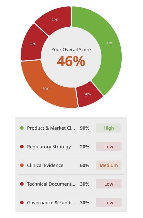 In just 3 minutes, get a clear, actionable view of how your product, regulatory strategy, evidence, documentation, and funding alignment stack up against what regulators and investors demand.